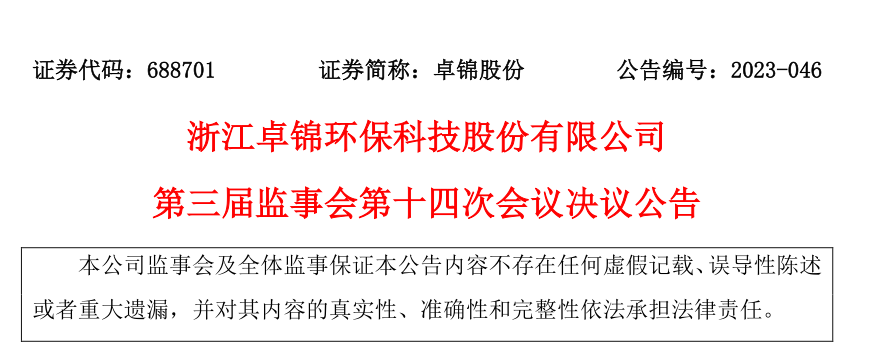 浙江卓錦環(huán)保科技股份有限公司第三屆監(jiān)事會第十四次會議決議公告