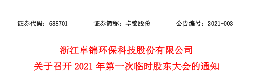 浙江卓錦環保科技股份有限公司關于召開2021年第一次臨時股東大會的通知