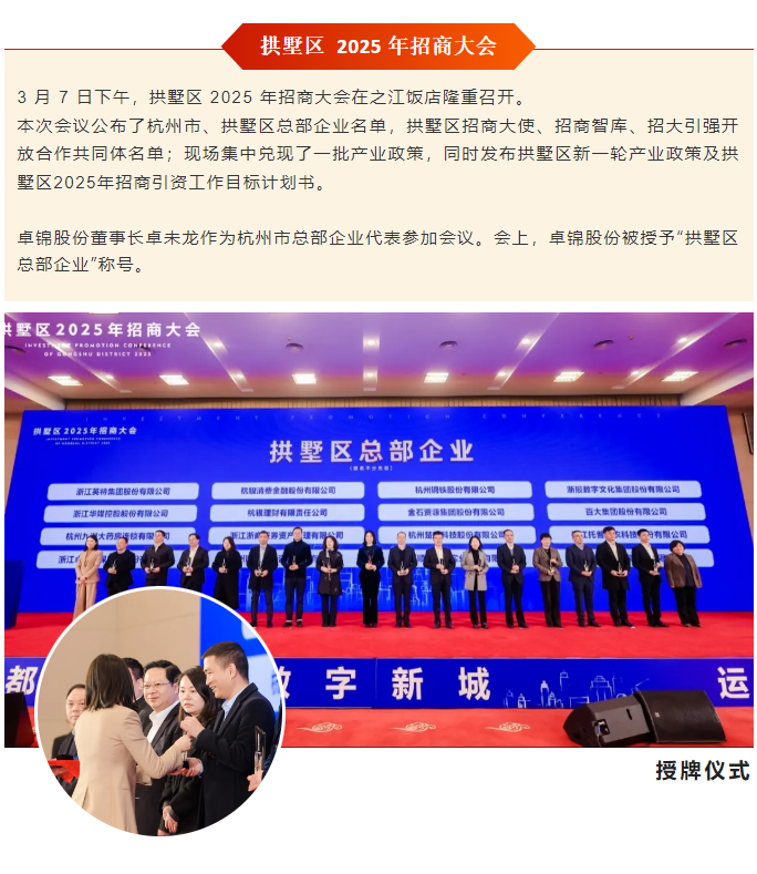卓錦股份授牌【拱墅區(qū)總部企業(yè)】